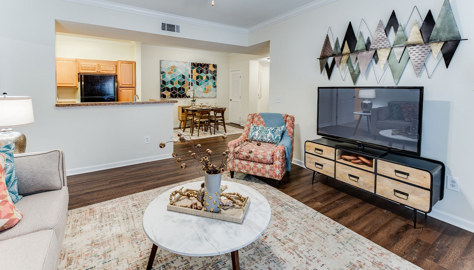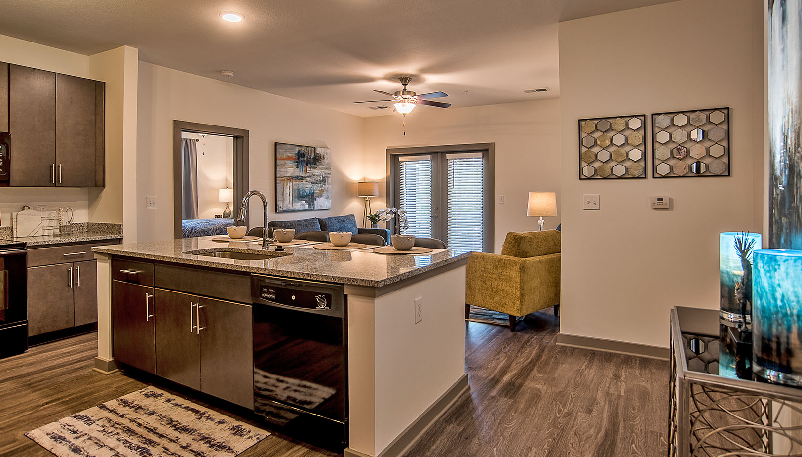 corporate apartment: beds, nightstands, dressers,